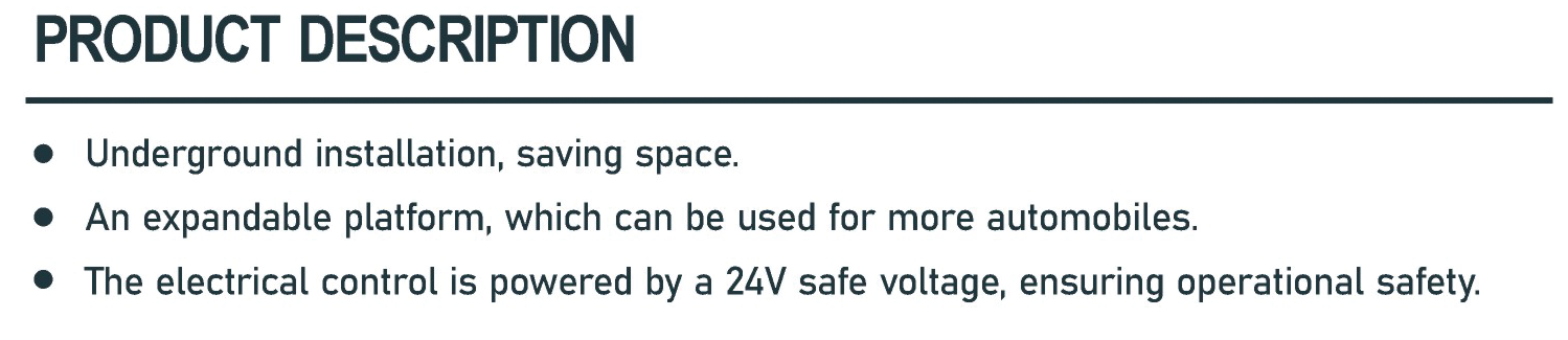 Underground installation,saving space. An expandable platform,which can be used for more automobiles.