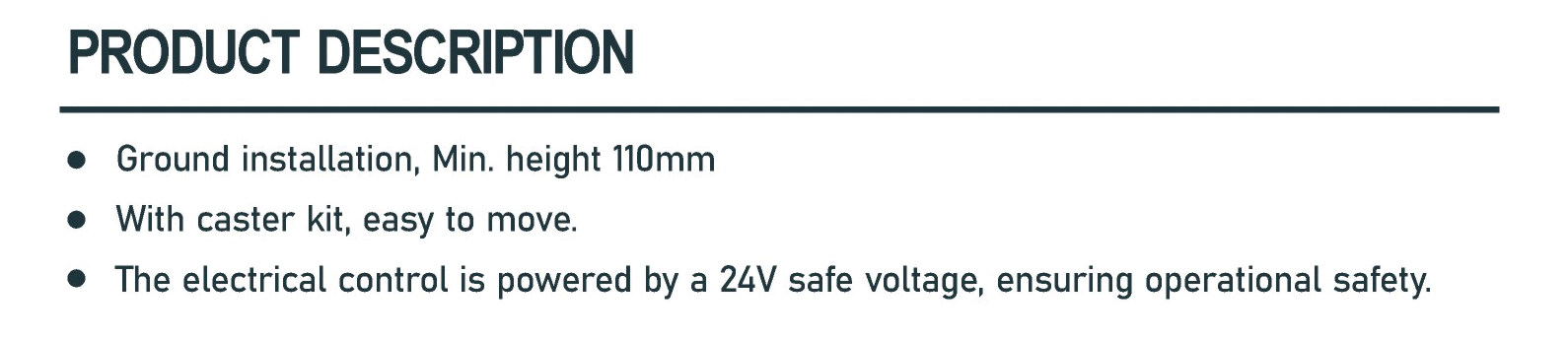 Ground installation,Min heigt 110mm.With caster kit,easy to move.The electrical control is powered by a 24V safe voltage,ensuring operational safety.